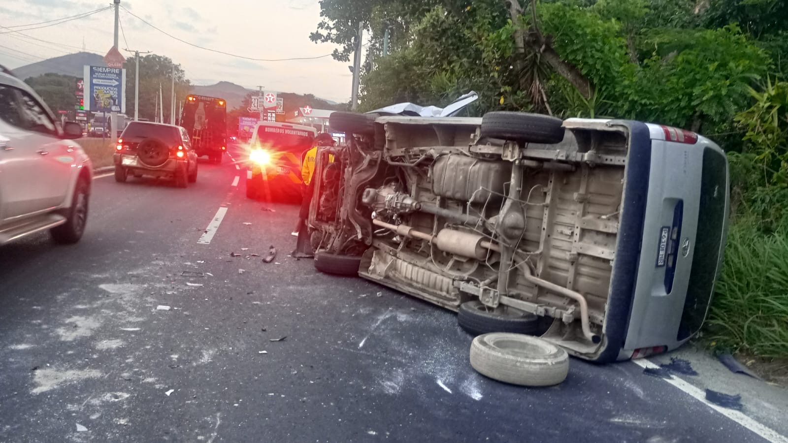 Un microbús de color gris, con placas P610FMR, volcó la mañana de este jueves 30 de abril en el kilómetro 42 de la ruta a El Salvador (CA-1 Oriente), en el sector La Vega, Barberena.