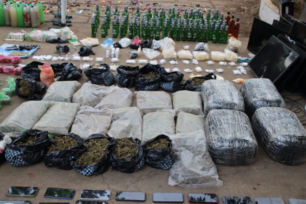En el lugar también fueron encontrados 55 envoltorios y 30 paquetes de marihuana, 185 botellas de licor, 21 paquetes de cigarros, así como 14 televisores, 10 aires acondicionados, dos selladores de plástico y diversos cables utilizados para generar corriente eléctrica.